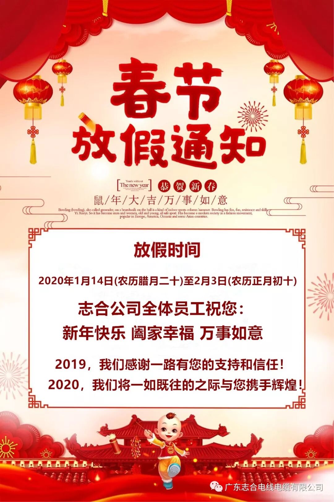 首先感謝貴司在2019年給予我公司的鼎力支持。在2020年春節(jié)即將來(lái)臨之際,志合公司全體員工提前恭祝新春愉快、生意興隆、財(cái)源滾滾!